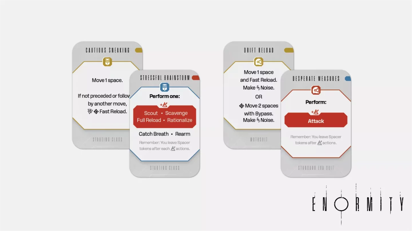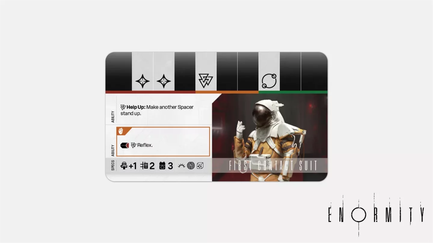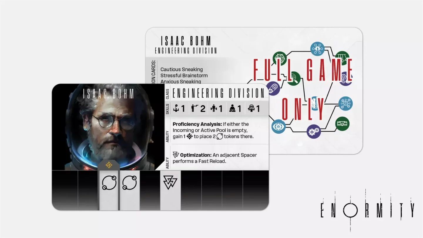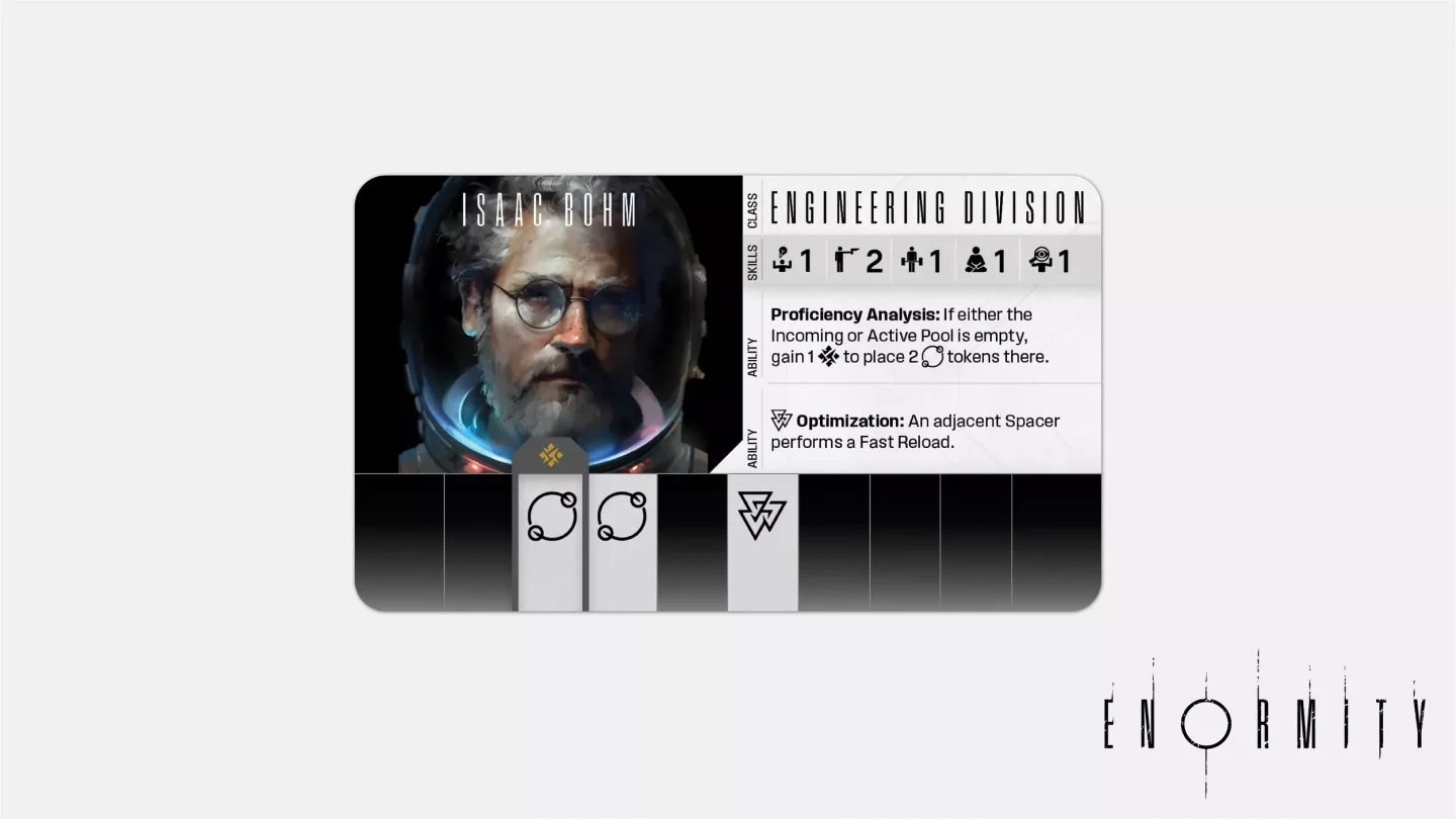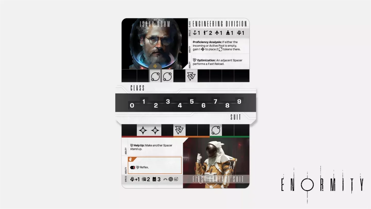 Characters are at the center of Enormity, and Enormity is all about player choice, blurring the line between board games and TTRPGs. Consequently, you’ll be able to play as one of the pre-generated Spacers – like Isaac Bohm here – or create your own.