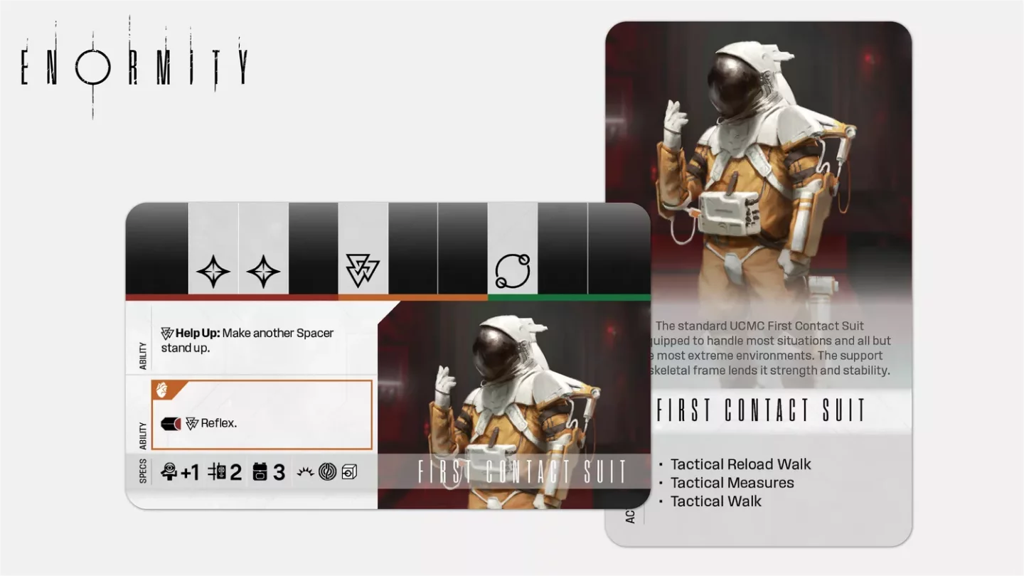 The front of the card shows the most important aspects of your Spacer, like their class, skills, abilities and Rubicon bonuses. Class determines your profession and how susceptible to stress and pressure you are, and gives you access to a unique progression tree, class-restricted gear and team-wide class Stratagems. Skills are used in various combat and non-combat tests, like noticing something, hacking a terminal or keeping your balance. Abilities are invaluable during your extraction runs and will either help you in combat or exploration. And finally, the Rubicon bonuses, the heart of our hard co-op mechanics… we’ll discuss them in a bit!